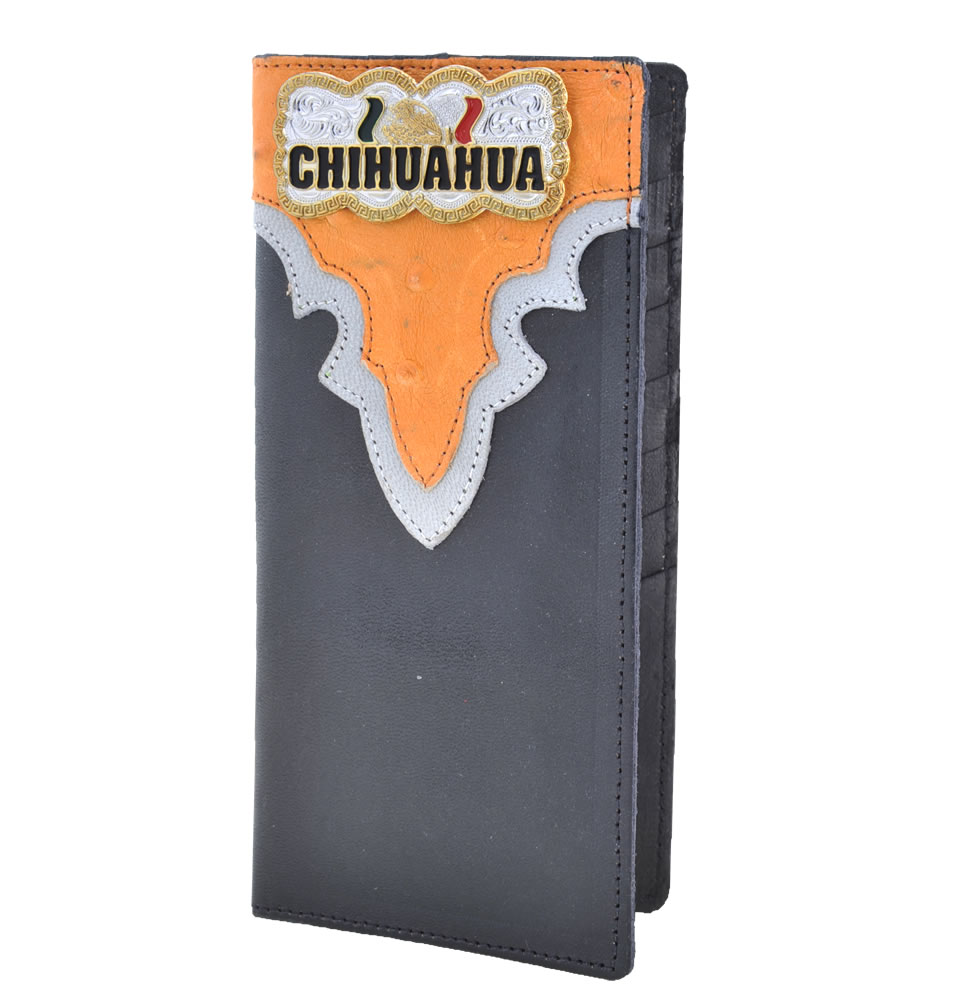 "Chihuahua", interior color black, vertical. Chequera vaquera de cuero de res grabado fino imitacion de avestruz aplicacion cosida sobre cuero gamuza y